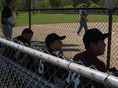 Well, I need not have worried. It took a game or two to adjust to the faster pitching, longer base runs, and head-first sliding, but he's totally up to speed now. It is taking me a longer time to figure out all the stupid new rules...what the heck is a balk???? I've never seen so many dumb rules! Oh, not to mention the "new" rules Alex has assigned to me. I am to no longer call him "Ally," "The A Man," "Big A," "Smiley," or "Bud," as in years past. Now it is "The AC," or nothing. I have also been given strict instructions to never take unsolicited pictures. Hmph!